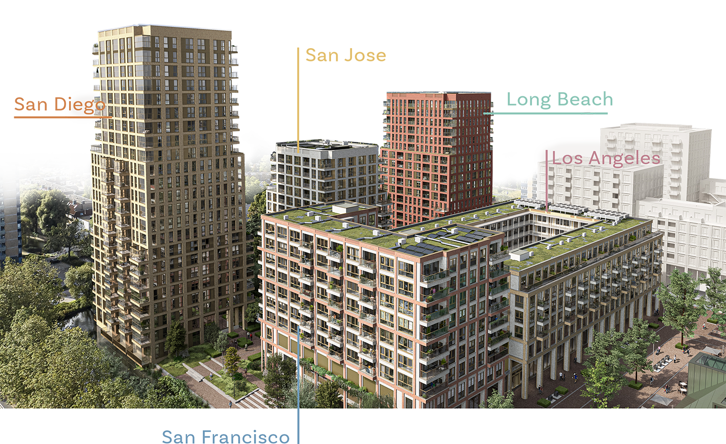 De 5 gebouwen genaamd San Diego, San Jose, Long Beach, Los Angeles en San Francisco, bieden 569 koop- en huurappartementen en worden verbonden door een levendig plein en tal van commerciƫle ruimten.